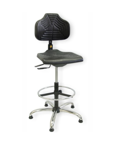 Ta stol je zasnovan z mislijo na udobje, ergonomijo in dolgotrajno uporabo. Integralna PU pena v črni barvi je pralna, odporna na nečistoče in zasnovana z zračnimi kanali za boljše udobje. Visoka stabilna konstrukcija z kromirano oporo za noge omogoča brezskrbno uporabo tudi v višjih delovnih položajih.